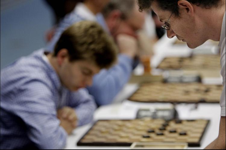 ZATERDAG – Anton van Berkel (voorgrond), de beste sneldammer van Nederland, speelt in Tilburg gelijktijdig 32 partijen tegen evenzoveel tegenstanders. Van Berkel moest in twee uur speeltijd alle partijen afwerken; hij had per zet vijf seconden bedenktijd. - Foto ANP