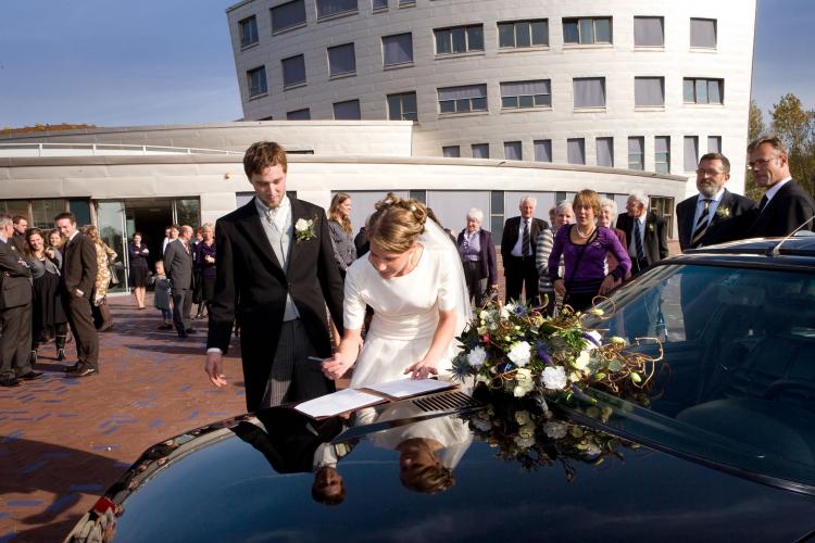 ZATERDAG – Bijna was de huwelijkssluiting van Pieter-Willem Capelle en Ellen van Zetten uit Dreischor ongeldig. De ambtenaar van de burgerlijke stand liet tijdens de voltrekking van het huwelijk in het gemeentehuis wel de getuigen tekenen, maar hij zag de bruid en de bruidegom over het hoofd. Toen het echtpaar met de familie buiten was, werd de vergissing ontdekt. Het stel tekende de akte alsnog op de motorkap van de trouwauto. - Foto Dirk Hol
