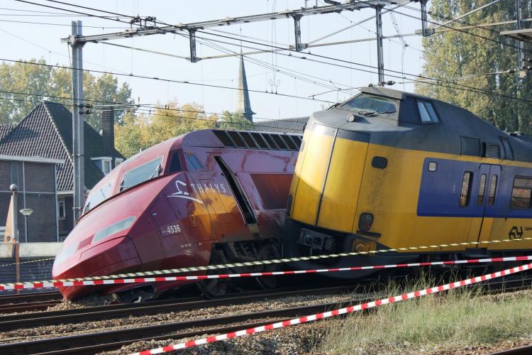 MAANDAG – Een Thalyshogesnelheidstrein botst op een intercity vlak bij het station van Gouda. De Thalys was onderweg van Amsterdam naar Parijs en werd omgeleid via Gouda omdat er tussen Den Haag en Rotterdam geen treinverkeer mogelijk was. Bij de botsing vielen geen gewonden. - Foto Wim de Jongste