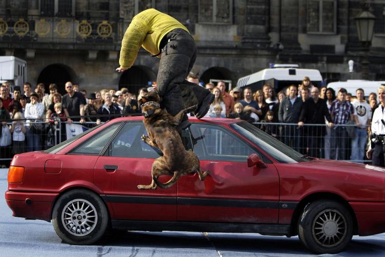 MAANDAG – Tijdens een demonstratie op de Landelijke Politiedag haalt een politiehond een boef van het dak van een auto op de Dam in Amsterdam. Op deze dag is het werven van nieuw personeel een belangrijk doel. Bezoekers konden tijdens de Landelijke Politiedag kennismaken met veel onderdelen van het politiewerk. - Foto ANP