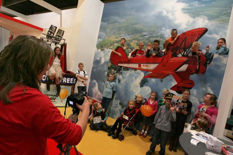 DINSDAG – In Utrecht ging de familiebeurs Wegwijs van start. Het is de zeventiende editie. Op de beurs presenteren tal van bedrijven en stichtingen hun producten. In de stand van het nieuwe kinderblad Kits konden de kinderen een vliegtuigfoto laten maken. - Foto RD, Anton Dommerholt