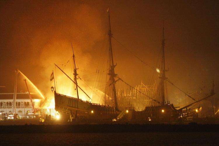 DINSDAG – Een felle brand heeft de zeilmakerij van de Bataviawerf in Lelystad in de as gelegd. De wereldberoemde replica van het VOC-schip De Batavia lag aan de bovenwindse kant en heeft geen schade opgelopen. Ook de in aanbouw zijnde replica van De Zeven Provinciën bleef gespaard. - Foto Ton Kastermans Fotografie