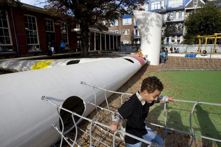 WOENSDAG – Kinderen spelen in het hart van het Rotterdamse Oude Noorden in een nieuwe speeltuin die bestaat uit afgedankte materialen. In de speeltuin staat een speciaal ontworpen speeltoestel dat bestaat uit vijf windmolenwieken, afkomstig van windenergieturbines. Per jaar worden in Nederland 200 van dit soort wieken weggegooid. De holle kunststofbuizen zijn gebruikt als torens en tunnels. - Foto ANP