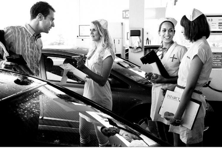 DONDERDAG – Om filerijders te troosten, deelden ‘verpleegsters’ kalmerende pillen uit aan automobilisten bij tankstation De Lucht-West op de A2. De stichting Struisvogel organiseerde de actie om politiek en overheid bewust te maken van het filevraagstuk. De stichting „wil beleidsmakers in Den Haag behoeden voor struisvogelpolitiek als het gaat om het fileprobleem.” - Foto ANP