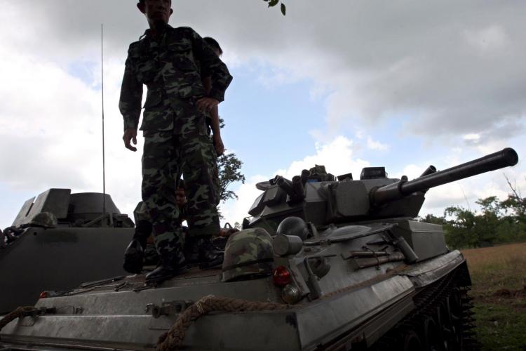 DONDERDAG – Thaise militairen bemannen een tank in het grensgebied met Cambodja. De legers van beide landen raakten opnieuw slaags rond een omstreden tempelcomplex dat beide staten als hun eigendom claimen. - Foto EPA