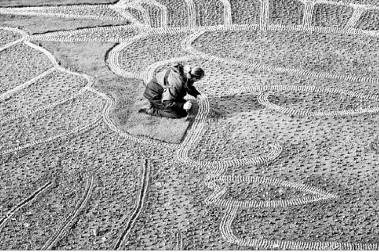 VRIJDAG – Een hovenier in de Keukenhof in Lisse legt de laatste hand aan een bloembollenmozaïek in de vorm van het Vrijheidsbeeld in New York. Het beeld moet een afmeting krijgen van 15 bij 12 meter. Voor de creatie gingen 36.000 bollen de grond in. - Foto ANP