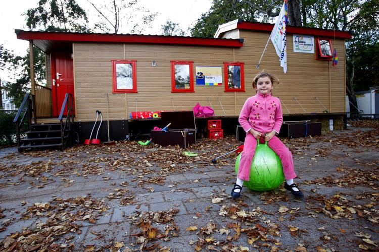 Een kind speelt na schooltijd bij de eerste Kindercaravan in Den Haag. De caravan is een nieuw concept voor buitenschoolse kinderopvang. Scholen, die vanaf dit schooljaar verplicht zijn buitenschoolse opvang aan te bieden, kunnen dit realiseren door een Kindercaravan te plaatsen. Hoewel de nadruk ligt op buitenspelen, is er ook de mogelijkheid om de kinderen bij slecht weer binnen op te kunnen vangen. - Foto ANP