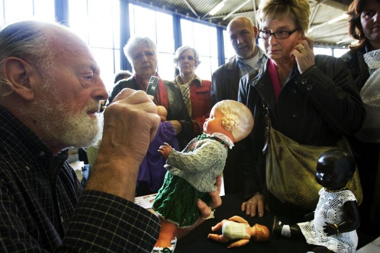 ZATERDAG – Op de Poppen- en Berenbeurs in Ahoy Rotterdam is Max Wolters de waarde van een pop aan het taxeren. Poppen- en berenmakers uit heel Europa zijn op deze jaarlijks terugkerende internationale beurs aanwezig. Ontwerpers gebruiken de beurs om hun zelf ontworpen poppen en beren te showen aan het publiek. Er is ook een berendokter aanwezig die beschadigde beren en poppen die door bezoekers zijn meegebracht kan repareren. - Foto ANP