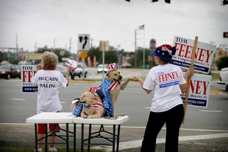 MAANDAG – Duizenden vrijwilligers voeren in de Verenigde Staten campagne voor hun favoriete presidentskandidaat. Michele Woodruff uit het stadje Titusville (Florida) heeft voor die gelegenheid haar honden flink uitgedost. - Foto RD, Henk Visscher