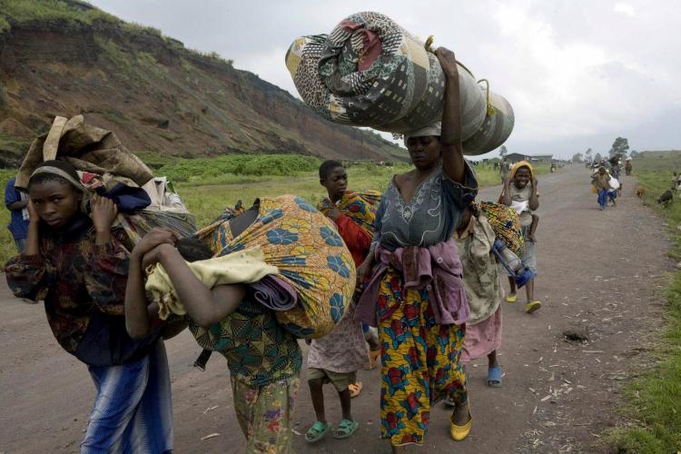 DINSDAG – Ontheemde Congolezen ontvluchten hun woonplaats Kibati, dicht bij de hoofdstad Goma. Tienduizenden burgers zijn op de vlucht geslagen door het hernieuwde geweld in het land tussen rebellenleider Nkunda en het regeringsleger. De VN-vredesmacht is niet in staat bloedvergieten te voorkomen. - Foto EPA