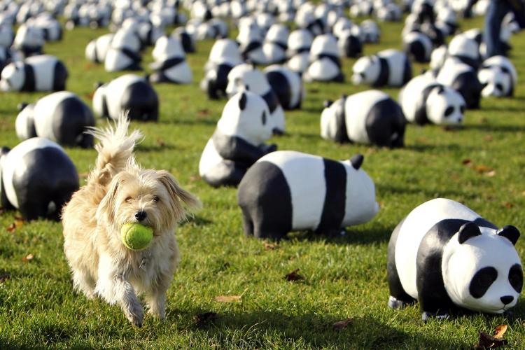 DONDERDAG – Een hondje tussen de pandaberen in Amsterdam. Het Wereld Natuur Fonds (WNF) plaatste 1600 panda’s op het Amsterdamse Museumplein. Hetzelfde aantal als de totale populatie panda’s wereldwijd. Met de actie wil het WNF, dat de panda in haar logo voert, de aandacht op de bedreigde diersoort vestigen. - Foto ANP
