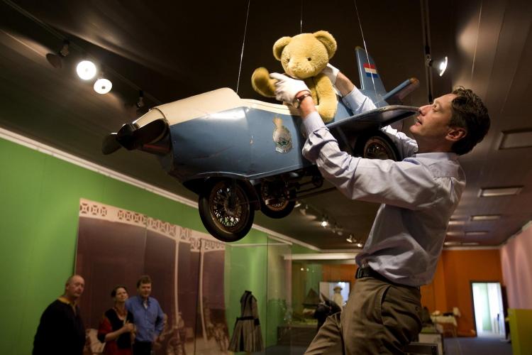 DONDERDAG – Een medewerker van Paleis Het Loo in Apeldoorn plaatst een beer in het speelgoedvliegtuig van prins Maurits. De tentoonstelling SpeelGoed op Het Loo is bijna gereed voor de opening. Op deze tentoonstelling staan onder meer poppen, spelletjes en ander favoriet speelgoed van de koninklijke familie vanaf de negentiende eeuw centraal. - Foto ANP