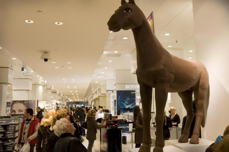 ZATERDAG – Bezoekers van de Bijenkorf kijken naar een levensgroot paard van chocola. Dit paard van Sinterklaas staat hier ter gelegenheid van ChocA, het jaarlijks terugkerende evenement waarbij diverse winkels hun kunsten in chocola kunnen presenteren. Bezoekers kunnen het gewicht van het chocoladepaard raden en hiermee kans maken op hun naam in chocoladeletters. - Foto ANP