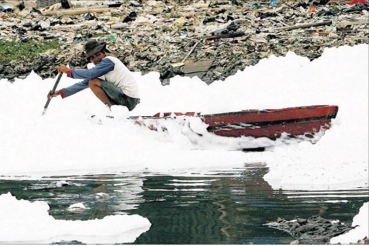 MAANDAG – Een Indonesische man peddelt over een zwaar vervuilde rivier in Jakarta. In veel landen werd aandacht aan Earth Day gegeven, om de bewustwording rond milieuvervuiling te vergroten en de waardering voor een schoon milieu te bevorderen. - Foto EPA
