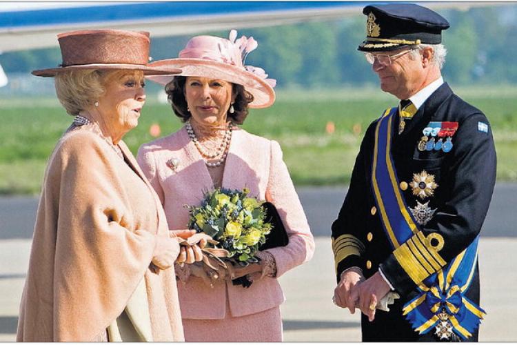 DINSDAG – Koning Carl XVI Gustaf en koningin Silvia van Zweden worden na hun aankomst op Rotterdam Airport verwelkomd door koningin Beatrix. Het Zweedse koninklijk paar brengt een driedaags staatsbezoek aan Nederland. - Foto ANP