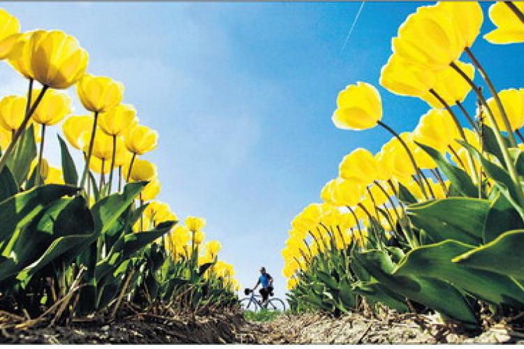 DINSDAG – Een man fietst langs een veld vol gele tulpen nabij het Noord Hollandse Egmond aan den Hoef. De bloembollenvelden in de regio staan volop in bloei en trekken ook dit jaar weer veel belangstellenden. - Foto ANP