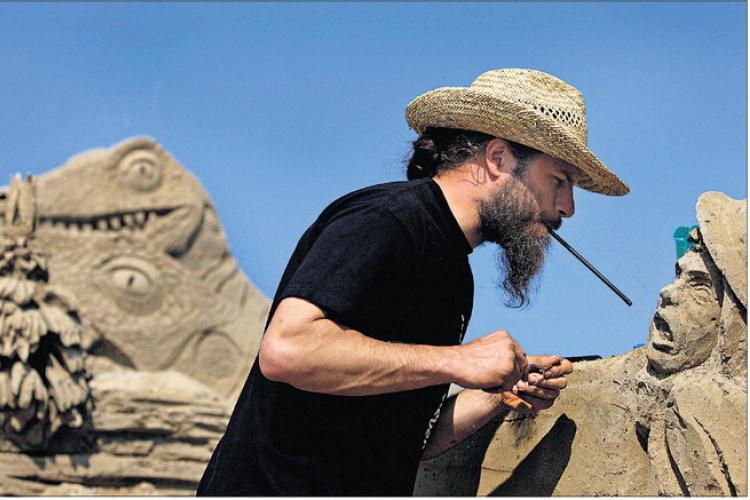 DINSDAG – Kunstenaars uit binnen en buitenland werkten aan hun creatie voor het Nederlands Zandsculpturenfestival, dat dit jaar ”Eilanden” als thema heeft. Met 10.000 ton zand worden langs de kust van het Waddeneiland sculpturen tot 12 meter hoog gebouwd. - Foto ANP