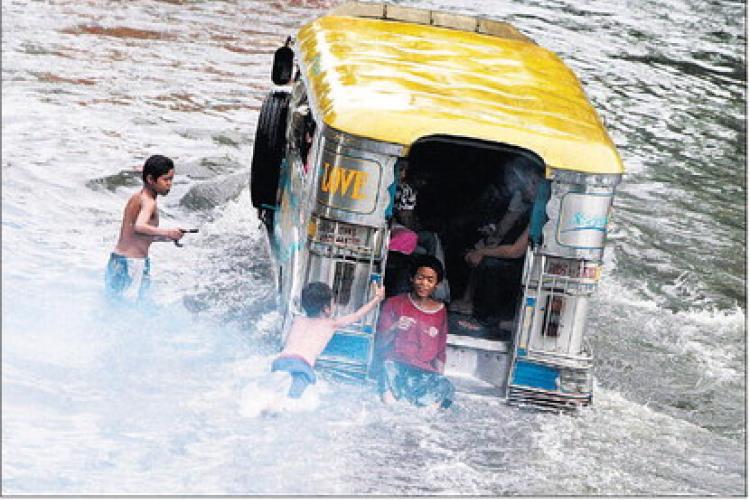 WOENSDAG – ‘Waterpret’ in Manilla. Hevige regenval veroorzaakte grote verkeersoverlast in de Filippijnse hoofdstad. - Foto EPA