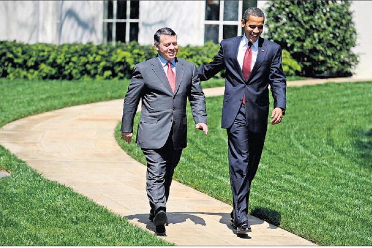 WOENSDAG – De Amerikaanse president Barack Obama ontvangt de Jordaanse koning Abdullah op het Witte Huis in Washington. Het gesprek tussen beide leiders ging vooral over het stagnerende vredesproces in het Midden Oosten en over de situatie in Irak. - Foto EPA