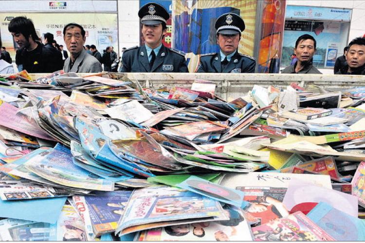 DONDERDAG – Politieagenten hebben naar schatting 1 miljoen gekopieerde dvd’s vernietigd in Shenyang, een stad in het noordoosten van China. De actie werd gehouden in het kader van de negende World Intellectual Property Day op 26 april. - Foto EPA