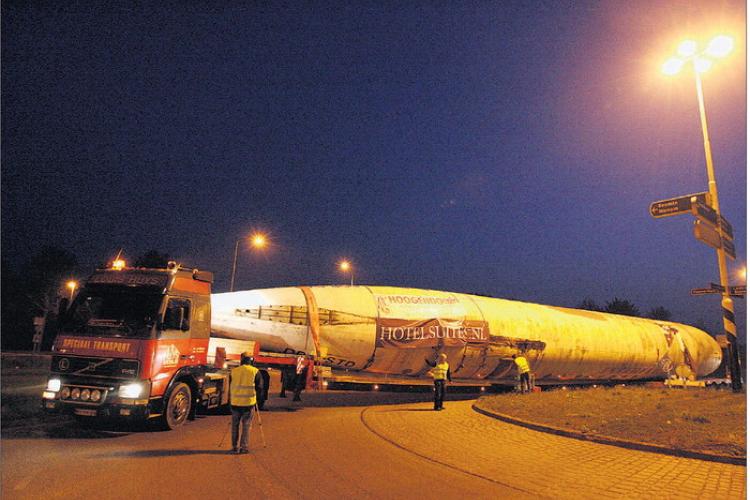 VRIJDAG – Moeizaam neemt een dieplader met daarop de romp van het 37 meter lange historische vliegtuig Ilyushin een rotonde bij Apeldoorn Noord. Het toestel was onderweg naar vliegveld Teuge. Het deed ooit dienst als regeringsvliegtuig voor de DDR en wordt omgebouwd tot een luxe hotelkamer. - Foto RD, Anton Dommerholt