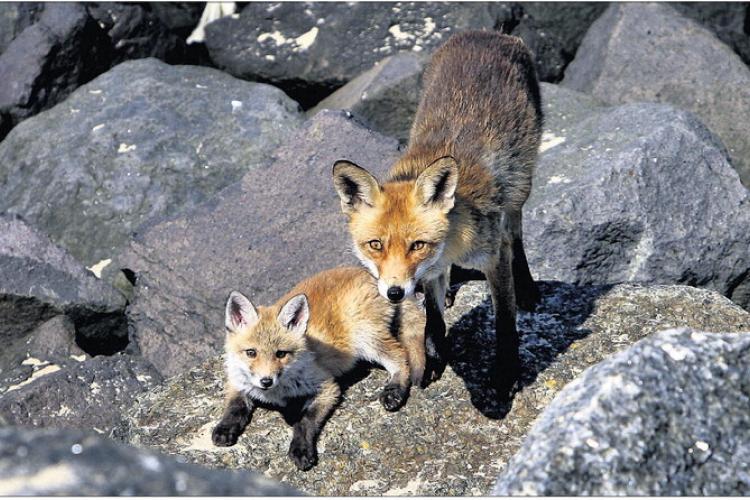 ZATERDAG – Een vossenmoeder heeft op een ongebruikelijke plek tussen de keien van een grote strekdam op het strand in IJmuiden twee jongen gekregen. ’s Nachts struint het gezin het strand af en gaat het tussen de huisjes op zoek naar eten. Het is de tweede keer dat het wijfje haar jongen tussen de stenen grootbrengt. - Foto ANP