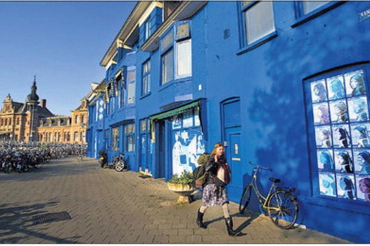ZATERDAG – Op het Stationsplein in Delft zijn slooppanden die deze zomer tegen de vlakte gaan, blauw geschilderd. Er werd een kunstproject van Delftse kunstenaars en scholieren geopend. - Foto ANP