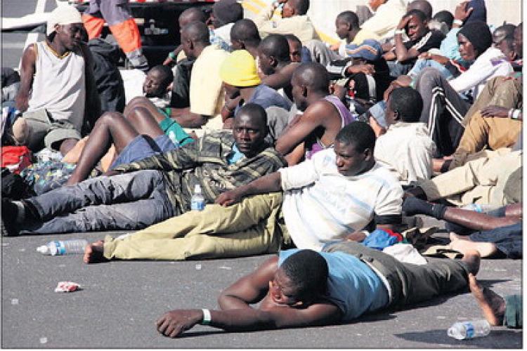 VRIJDAG – Eenenzeventig immigranten uit Mauritanië die door de Spaanse kustwacht waren gered, liggen uitgeput in de haven van San Sebastian te wachten op verdere hulp. - Foto EPA