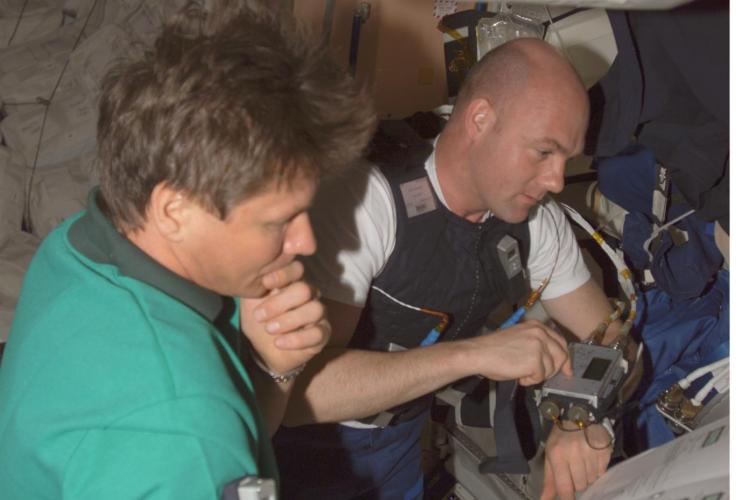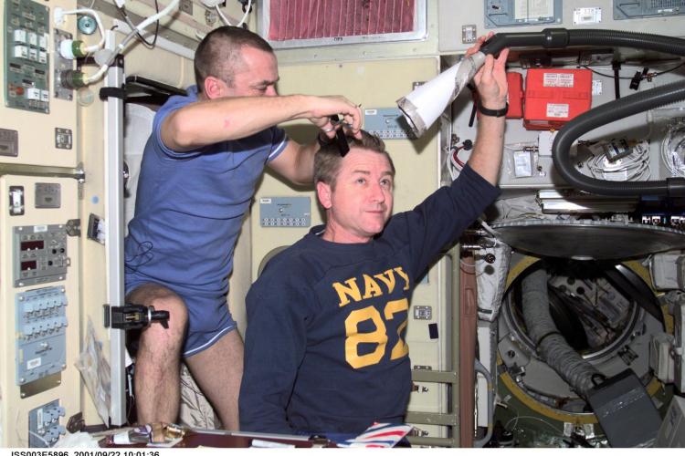 Handelingen die op aarde tamelijk eenvoudig zijn, worden onder gewichtsloze omstandigheden opeens een hele klus. Zo schijnt een scheerbeurt de heren nogal wat last te bezorgen. Wie zich nat wil scheren, ontdekt dat water en schuim maar slecht aan het gezicht of aan het mesje blijven hangen. Wie zich droog wil scheren, moet de stofzuiger ernaast houden om te voorkomen dat de haarstoppels alle kanten op vliegen. Scheren doen de mannen dus zo min mogelijk. - Foto NASA