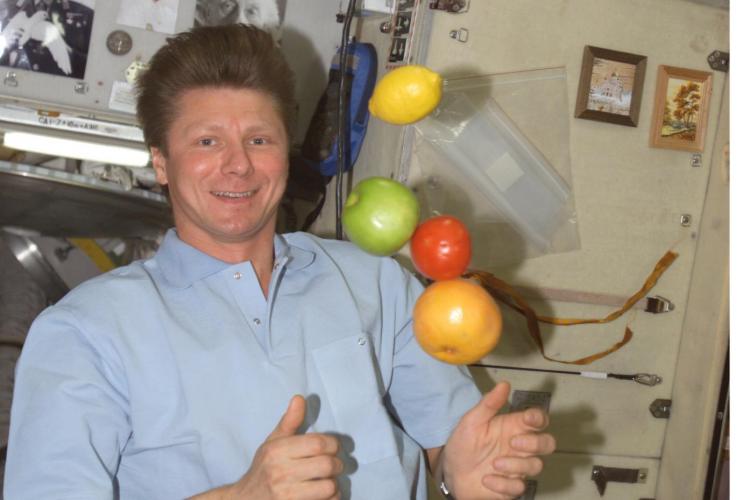 Eten en drinken gaan in de ruimte ook al niet zo eenvoudig als thuis. Vast voedsel is daarom heel plakkerig, om te voorkomen dat er aan het einde van de maaltijd allemaal kruimels rondzweven. Vloeistoffen, zoals koffie en soep, zuigen de astronauten met een rietje op uit een zak. Het gebrek aan zwaartekracht nodigt overigens wel uit tot het spelen met eten, zo blijkt uit talloze foto’s en filmpjes. - Foto NASA