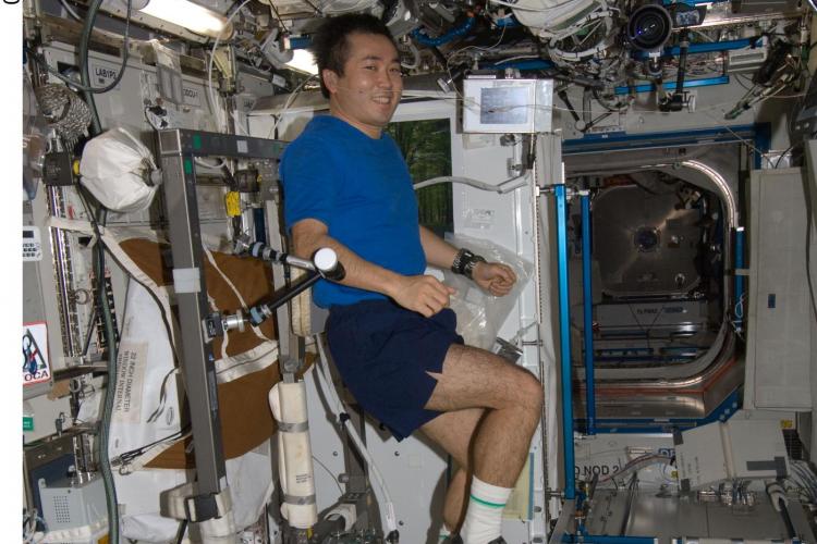 Om de spiermassa, die in de ruimte nauwelijks wordt belast, op peil te houden, is sporten een dagelijks weerkerende activiteit. De astronaut bindt zichzelf hierbij vast aan de loopband of de hometrainer, zodat hij niet wegzweeft en de nodige kilometers kan maken. - Foto NASA