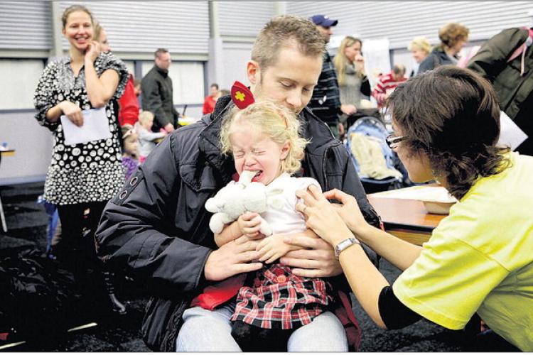 MAANDAG – De anderhalf jaar oude Gemma werd maandagmorgen in de Amersfoortse sportlokaal de Bokkeduinen gevaccineerd tegen de Mexicaanse griep. Gemma zit bij vader op schoot, links achter haar staat moeder. De ouders lieten zich ook vaccineren. - Foto Sjaak Verboom