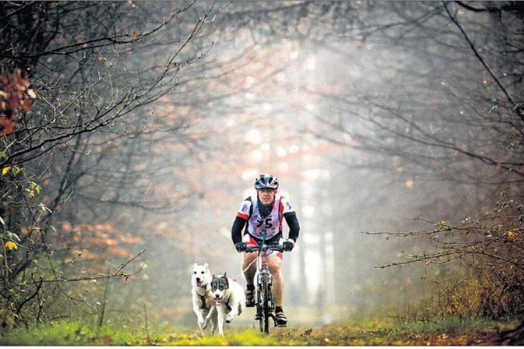 MAANDAG – In de bossen van het Drentse Grolloo is zaterdag de karrenwedstrijd voor sledehonden gehouden. Naast de wedstrijden waarbij tien of twaalf honden een karretje over het parcours trekken, waren er wedstrijden met een of twee honden die een fiets of step trekken. - Foto ANP