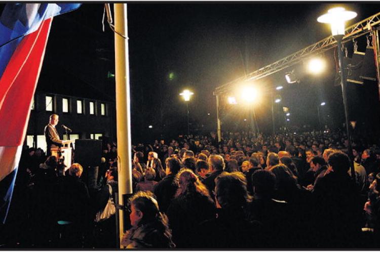 WOENSDAG – Burgemeester Kroon van Urk sprak dinsdagavond aan het eind van de stille tocht voor Dirk Post de menigte toe. - Foto ANP