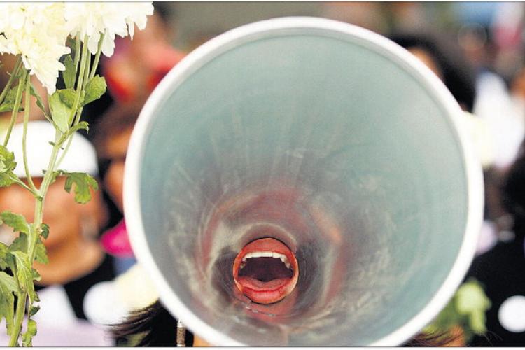 DONDERDAG – Een vrouw schreeuwt leuzen door een megafoon tijdens een mars op de Internationale Dag voor de Uitbanning van Geweld tegen Vrouwen. De mars had woensdag plaats in de Peruaanse hoofdstad Lima. - Foto EPA