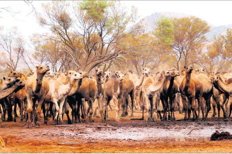 DONDERDAG – De autoriteiten in Australië laten de komende week een kudde van circa 6000 wilde kamelen (zie foto) afmaken. Als gevolg van de extreme droogte hebben de dieren hun toevlucht gezocht tot het afgelegen dorp Docker River, waar ze grote overlast veroorzaken voor de mensen die daar wonen. - Foto EPA