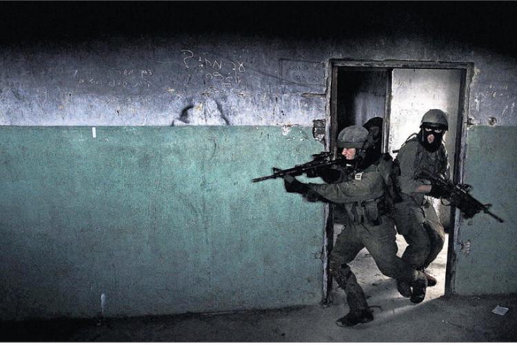 VRIJDAG – Infanteristen van het Israëlische leger vallen tijdens een oefening op de Golanhoogte een woning binnen. Het Israëlische leger oefende donderdag op de Golan. Israël veroverde de strategisch gelegen berg op Syrië tijdens de Zesdaagse Oorlog in 1967. - Foto EPA