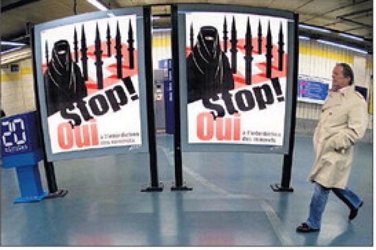 ZATERDAG– Een man passeert een poster van de SVP, waarmee de partij het verbod op minaretten in Zwitserland propageert. - Foto EPA