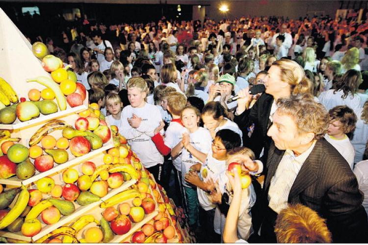 ZATERDAG – Scholieren in het Overijsselse Ommen maakten vrijdag de grootste fruitschaal van Nederland, bij de aftrap van de campagne ”Ik lekker fit!?”. Dit is een initiatief om basisschoolleerlingen te stimuleren gezond en actief te leven. De fruitschaal werd onthuld in het bijzijn van voorzitter Paul Rosenmöller van het Convenant Overgewicht. - Foto ANP
