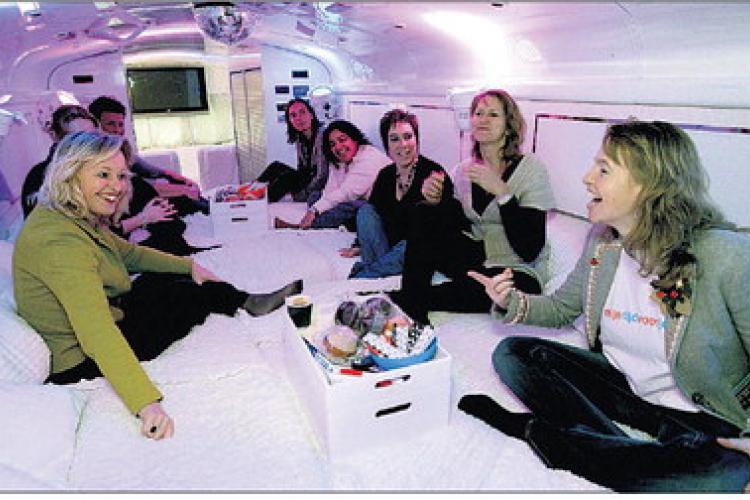 WOENSDAG - Staatssecretaris Bussemaker (l.) van Volksgezondheid deed mee aan een ‘droomsessie’ van medewerkers van de thuis- en ouderenzorg. Die vond plaats in een groot bed in een touringcar. Ze bespraken hoe de kwaliteit van de zorg kan worden verbeterd. - Foto ANP