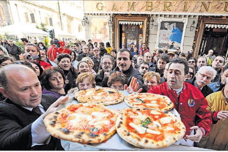 DONDERDAG – Honderden mensen verzamelden zich op het Plebiscitoplein in de Italiaanse stad Napels om het besluit van de EU te vieren dat de Napolitaanse pizza het label ”Traditional Speciality Guaranteed” heeft gekregen. - Foto EPA