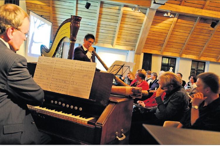 DONDERDAG - In Rijssen is voor het eerst een compositie voor midwinterhoorn en harmonium uitgevoerd: ”Gangs goan”. Dat gebeurde tijdens een ”Mirreweenteroawend” met verhalen in het Twents en klassieke muziek. Componist Dick Sanderman (l.) begeleidde midwinterhoornblazer Ineke Leusman op het harmonium. - Foto AvdMpixels