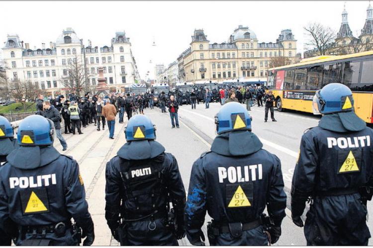 VRIJDAG - Een grimmige sfeer heerste in de straten van Kopenhagen, waar de Deense politie in oog in oog stond met zo’n 500 antikapitalistische activisten die betoogden tegen de klimaattop. Zeker 68 betogers werden gearresteerd. Een deel van de arrestanten kwam uit het buitenland, meldde de politie. - Foto EPA