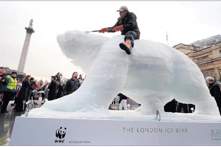 VRIJDAG - Een ijsbeer op Trafalgar Square in Londen smelt in tien dagen. IJssculpturenmaker Mark Coreth stuurt met zijn kunstwerk een waarschuwing naar Kopenhagen. - Foto EPA