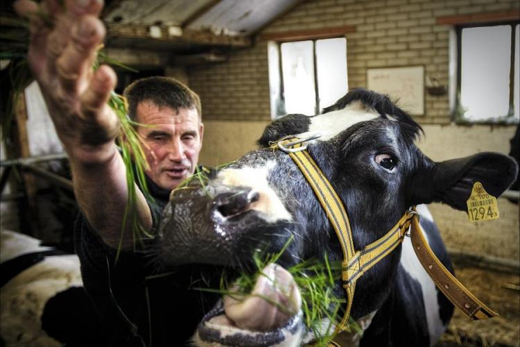 ZATERDAG - Boer Theo Spruit geeft een hand gras aan zijn superkoe. De Koe Beatrix 39 is zaterdagmiddag door minister Verburg (LNV) gehuldigd in de stal. Beatrix 39 ontving een mandje met vers gras en het predikaat 'meest duurzame koe'. In haar vijftienjarige leven produceerde Beatrix 39 100.000 kilogram melk, waarvan 10.000 kilo vet en eiwitten. Dit is een extreem goede melkproductie in vergelijking met andere koeien. Het melkveebedrijf van Boer Theo Spruit besteedt veel aandacht aan duurzame productie. - Foto ANP
